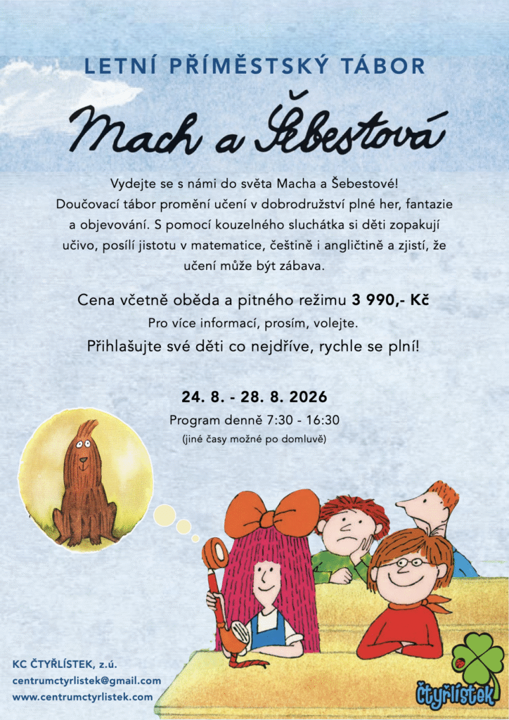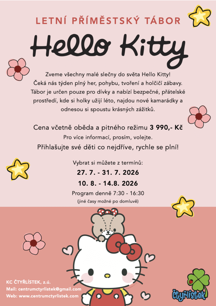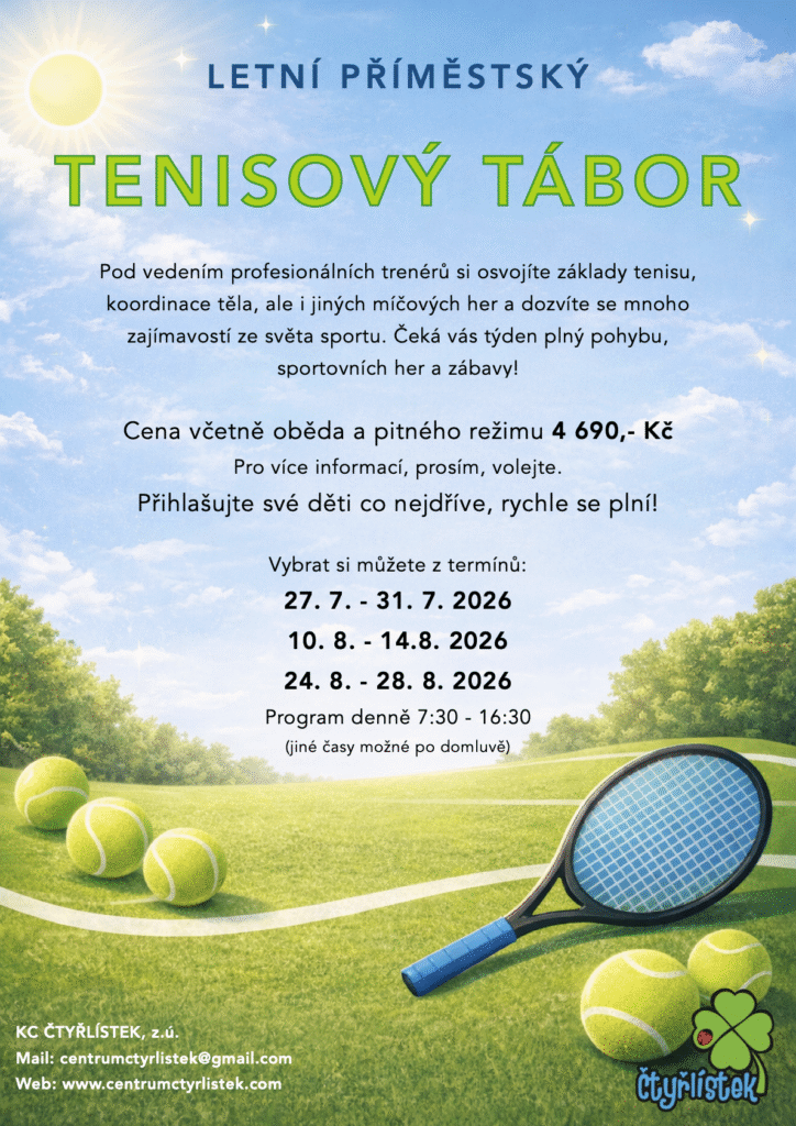 Léto plné zábavy a dobrodružství Každé léto připravujeme několik příměstských táborů pro děti od 5 do 12 let. Tábory probíhají vždy od 7:30 do 16:30 a děti u nás čeká zábava, hry, sport i učení v přátelském prostředí. Termíny a programy 2026 • 27. 7. – 31. 7. Hello Kitty tábor / Tenisový tábor• 10. 8. – 14. 8. Hello Kitty tábor / Tenisový tábor• 24. 8. – 28. 8. Doučovací tábor / Tenisový tábor
